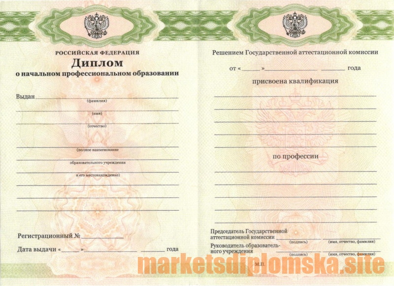 Предлагаем сразу купить диплом училища нового образца, утвержденный государственным стандартом. Этот документ включает в себя титульный и приложение с указанием данных получившего лица, период посещения, приобретенную специальность, присвоенную после обучения классность или разряд. Во вкладыше указано название учебного заведения, выдавшего этот документ и подписи ответственных лиц с мокрой печатью.